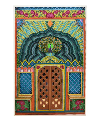 Adorn your sacred space with this vibrant hand-embroidered Mayur (peacock) Darwaza artefact. Featuring a majestic peacock arch and opening jaali doors, it’s a soulful blend of heritage craft and divine color, perfected with ~100 hours of handwork.