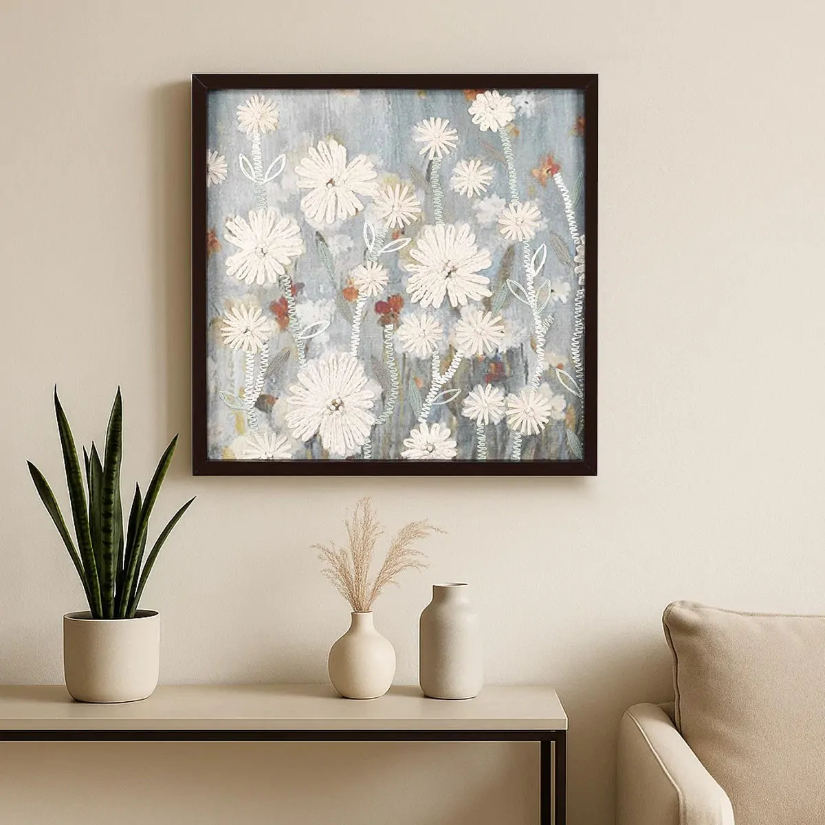 Large pieces work well above sofas, beds, or dining areas. Smaller embroidered frames look elegant in clusters on gallery walls.