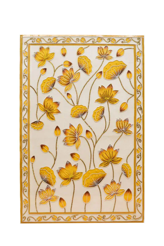 Crafted by master artisans from Rajasthan, this panel brings together clusters of soft pink lotus blossoms, floating buds, and fresh green leaves. Every motif is embroidered with delicate threads and hand-placed beads, forming a natural rhythm across a cream-colored base — like sacred water holding floating prayers.