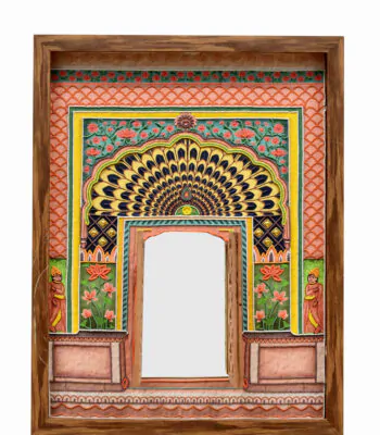 Step into sanctity with this hand-embroidered artefact, featuring a radiant peacock-inspired arch and intricate openable jaali door and a mirror. Ideal for sacred spaces, altars, or spiritual corners in your home, perfected with ~70 hours of handwork.