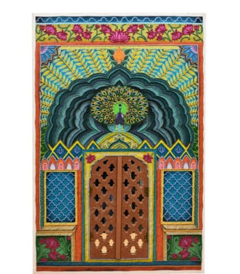 Adorn your sacred space with this vibrant hand-embroidered Mayur (peacock) Darwaza artefact. Featuring a majestic peacock arch and opening jaali doors, it’s a soulful blend of heritage craft and divine color, perfected with ~100 hours of handwork.
